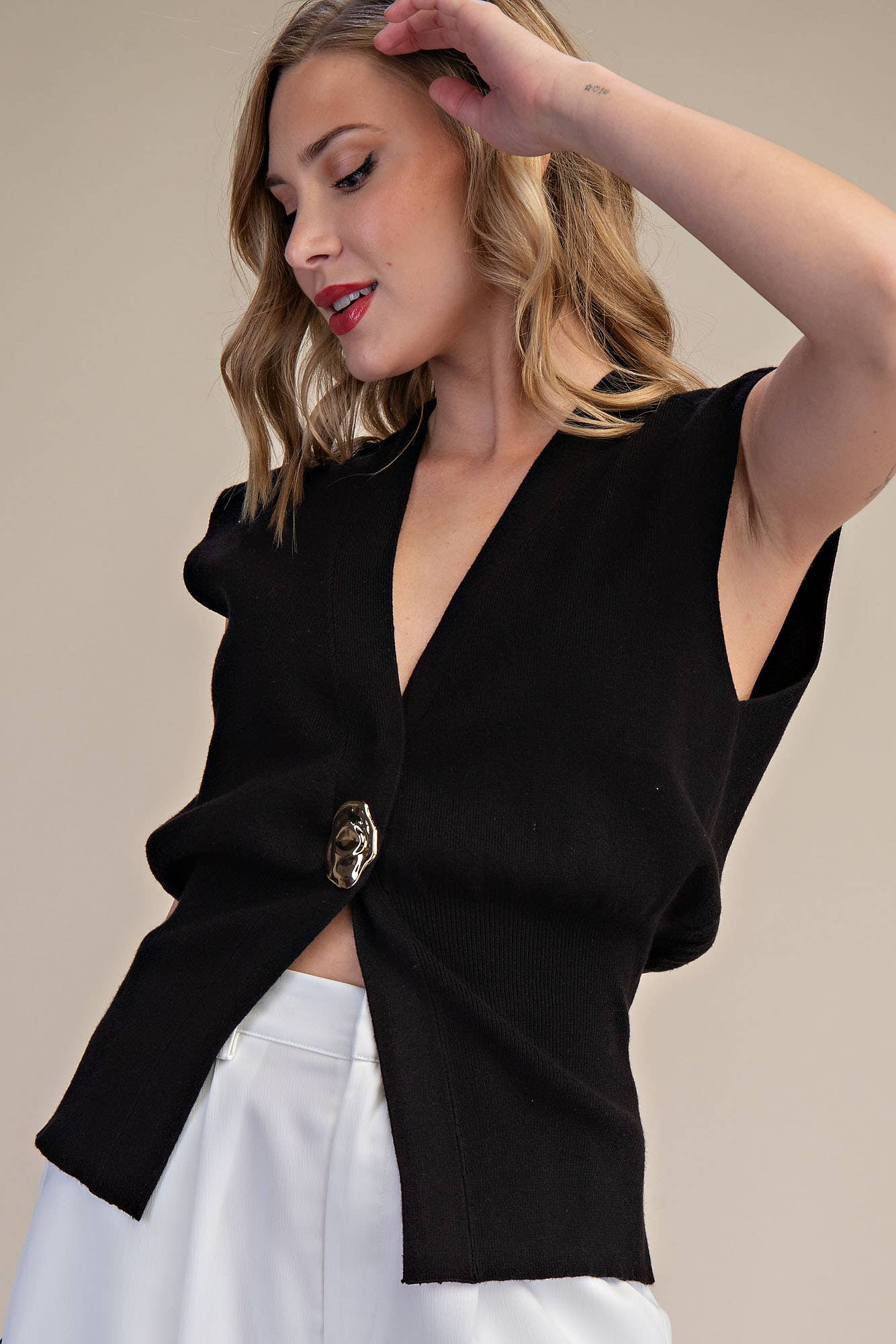 Sleeveless V-Neck Knit Vest - Black